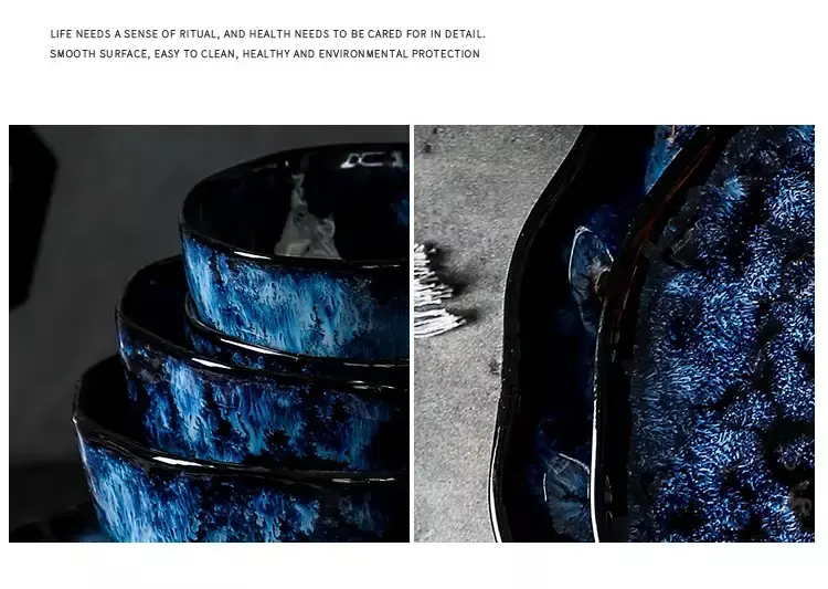• Kiln Changed Ceramics: The unique beauty of this set lies in the Kiln Changed technique, where the glaze undergoes unpredictable transformations during firing. This ensures that each blue-hued plate and bowl is subtly unique and full of personality.