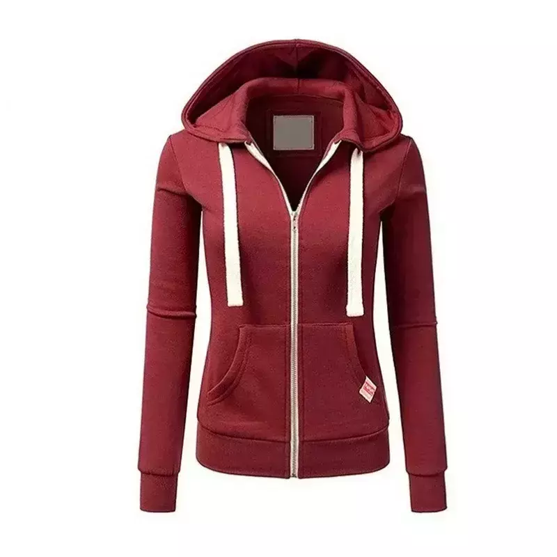 • Plain women's fleece jacket with zipper closure and drawstring hood. Ideal for a casual, laid-back look during colder seasons.