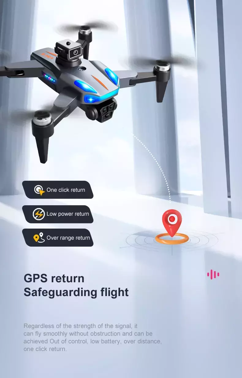 • Safety First: The 360° Obstacle Avoidance system ensures collision-free flight, automatically avoiding obstacles. GPS Return provides peace of mind, as the drone returns to its starting point at the touch of a button, even in the event of low battery or signal loss.