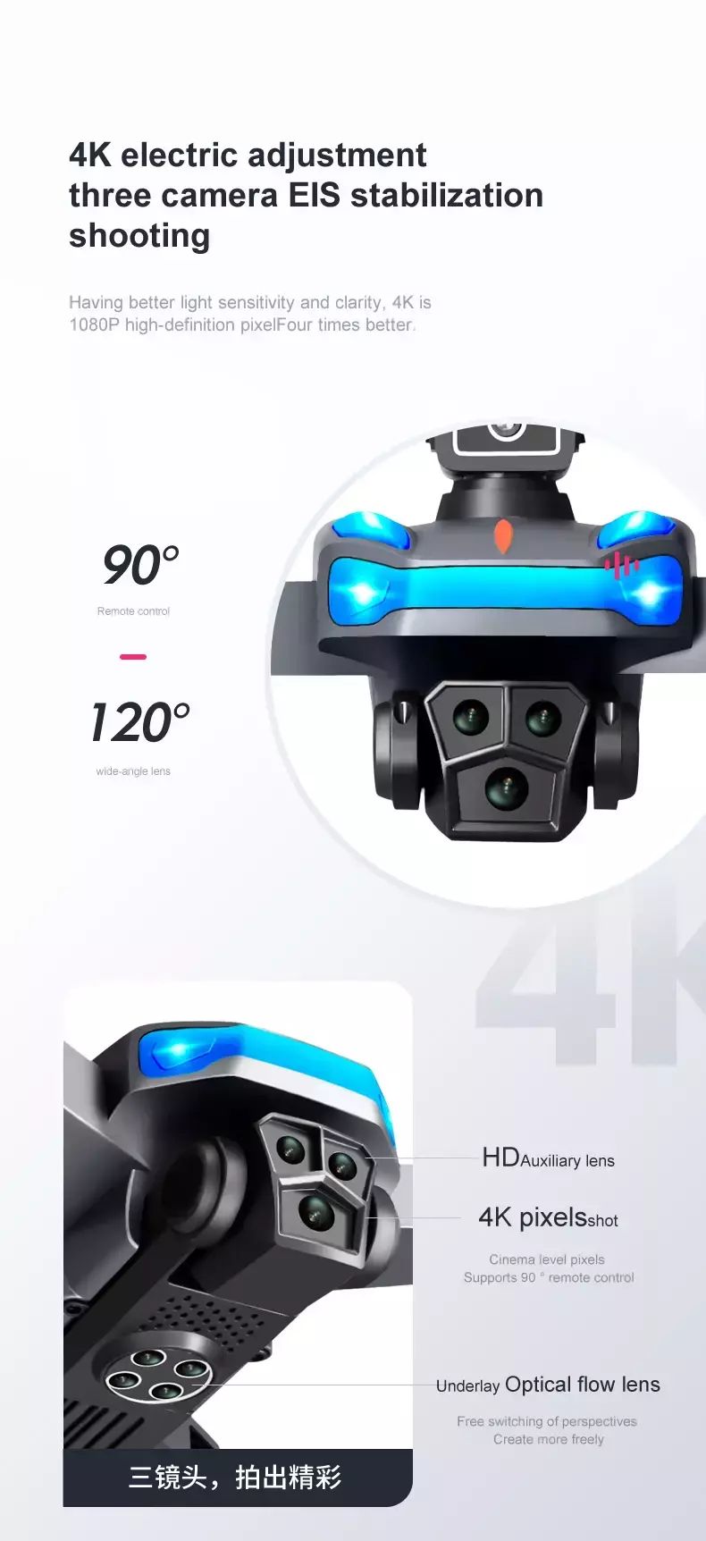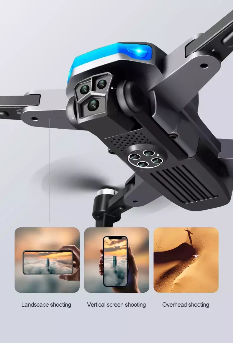 • 4K HD Image Quality: The Triple Camera allows you to capture images and videos from multiple perspectives (horizontal, vertical, and aerial). 4K HD quality with EIS image stabilization ensures sharp, shake-free footage. • High-Performance Flight: The brushless motor offers a more powerful, stable flight with up to 5-speed wind resistance. With a long-lasting battery, you can enjoy up to 20 minutes of flight time, while HD image transmission at 600m provides a clear, real-time view.
